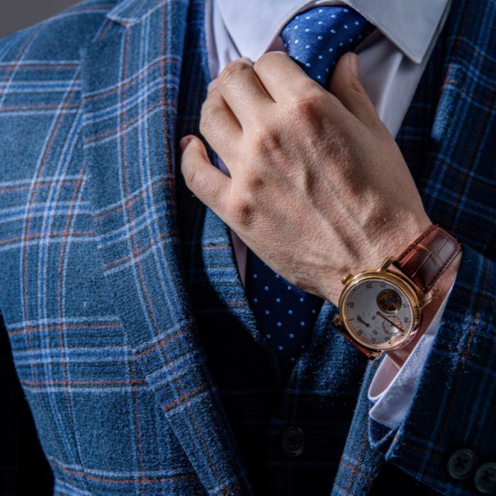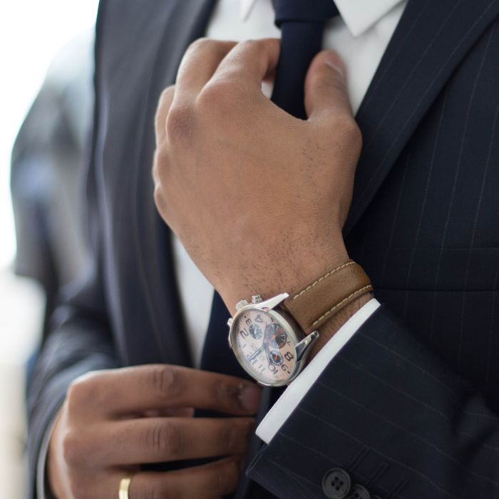 정장과 시계 매칭의 기본은 벨트와 시계 스트랩의 색상을 맞추는 거예요. 검은색 구두와 벨트를 착용했다면 검은색 가죽 스트랩이 자연스럽고, 갈색 구두라면 갈색 스트랩이 조화로워요. 메탈 브레이슬릿은 어떤 색상과도 무난하게 매치되지만, 너무 반짝이는 폴리싱보다는 브러싱 처리된 제품이 비즈니스에 적합하답니다.